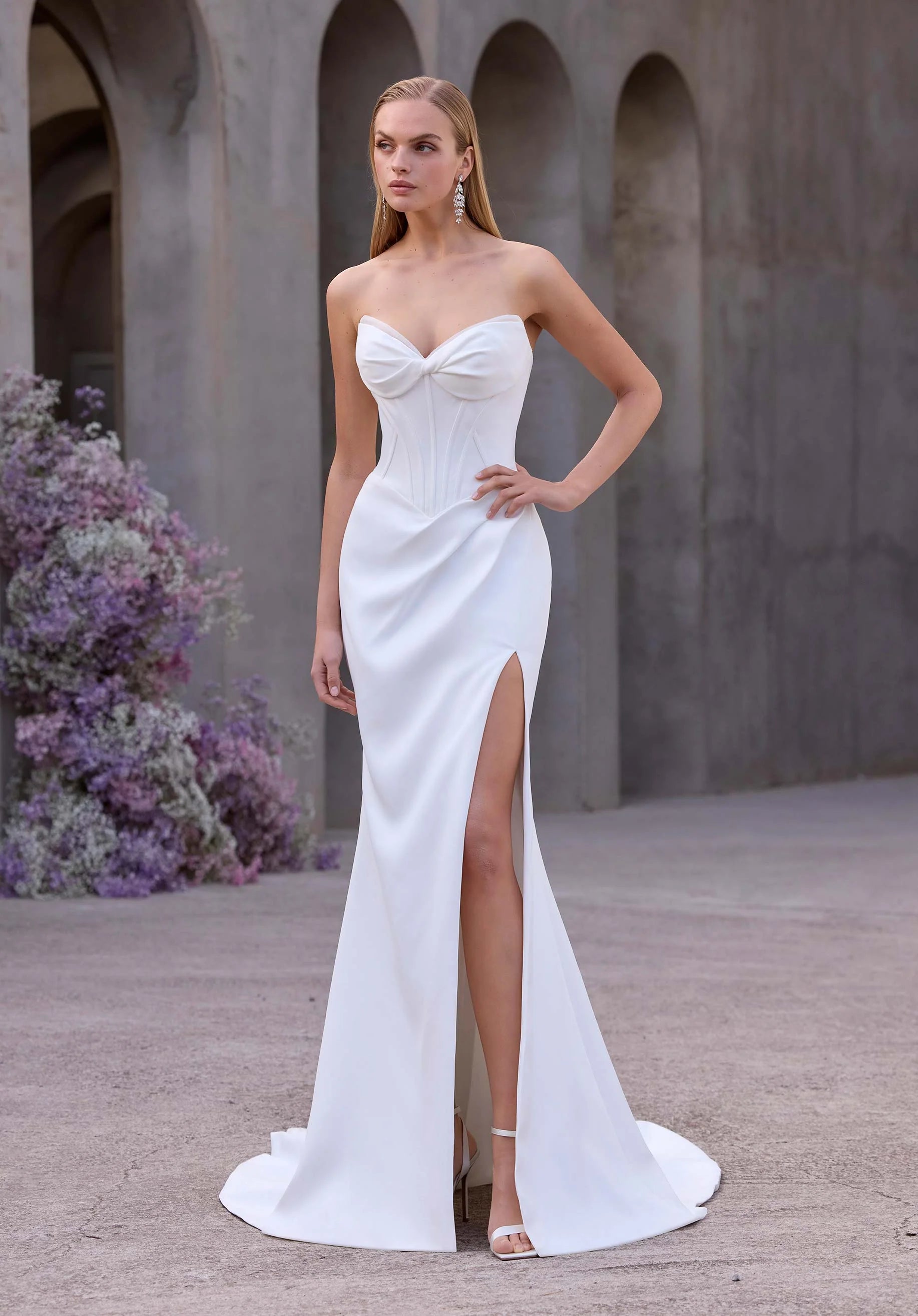 Satin mermaid wedding dress has a strapless twist sweetheart neckline and a stylized boned bodice on a draped wrap skirt.