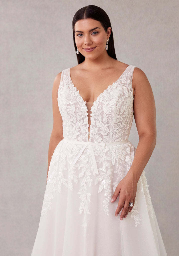 Boho A-line wedding dress has a plunging V-neck bodice with embroidered lace appliqués on Chantilly lace with grosgrain ribbon bow waistband and a glitter net skirt.