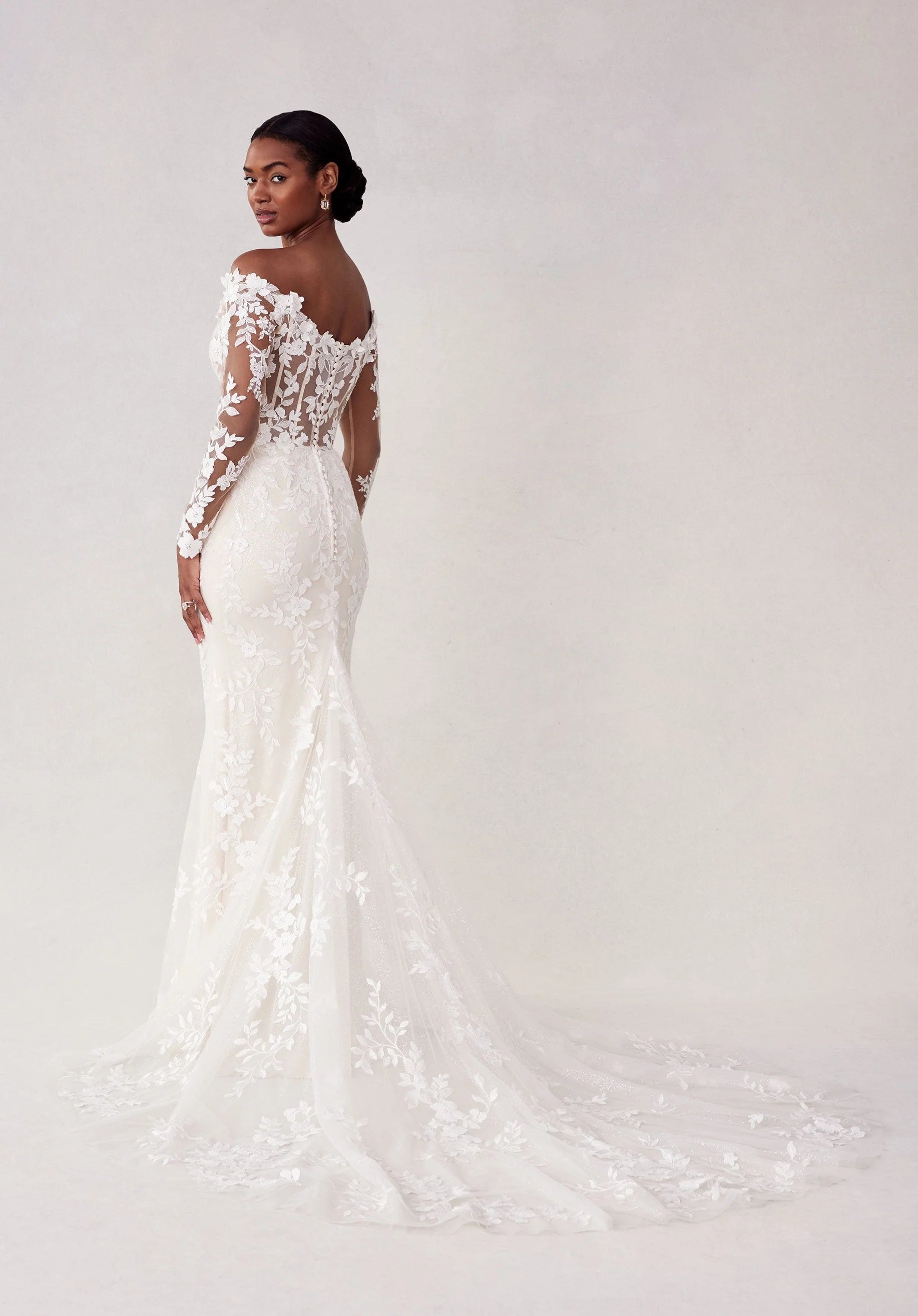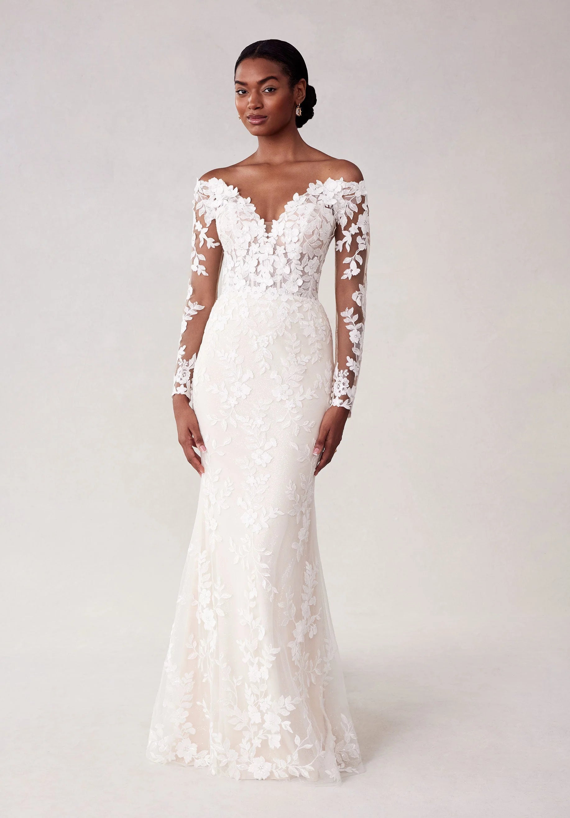 Romantic fit and flare wedding dress has an off-the-shoulder neckline with long sleeves and a sheer back in embroidered 3D floral lace on glitter tulle.
