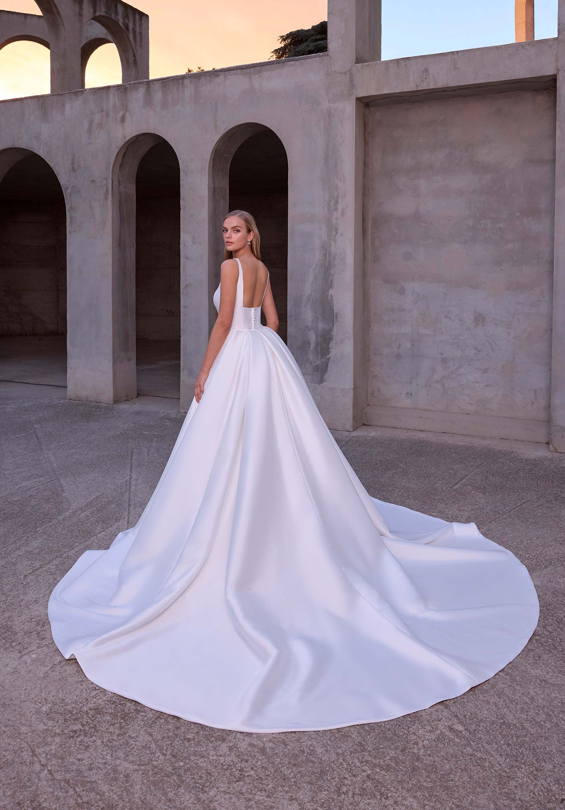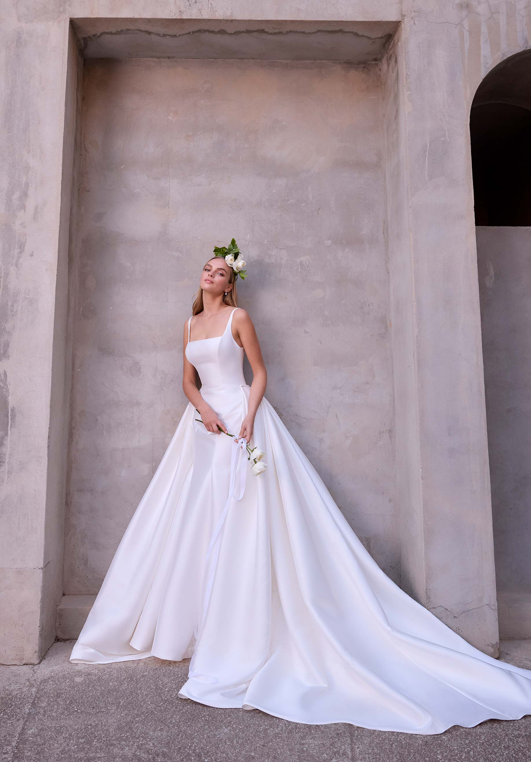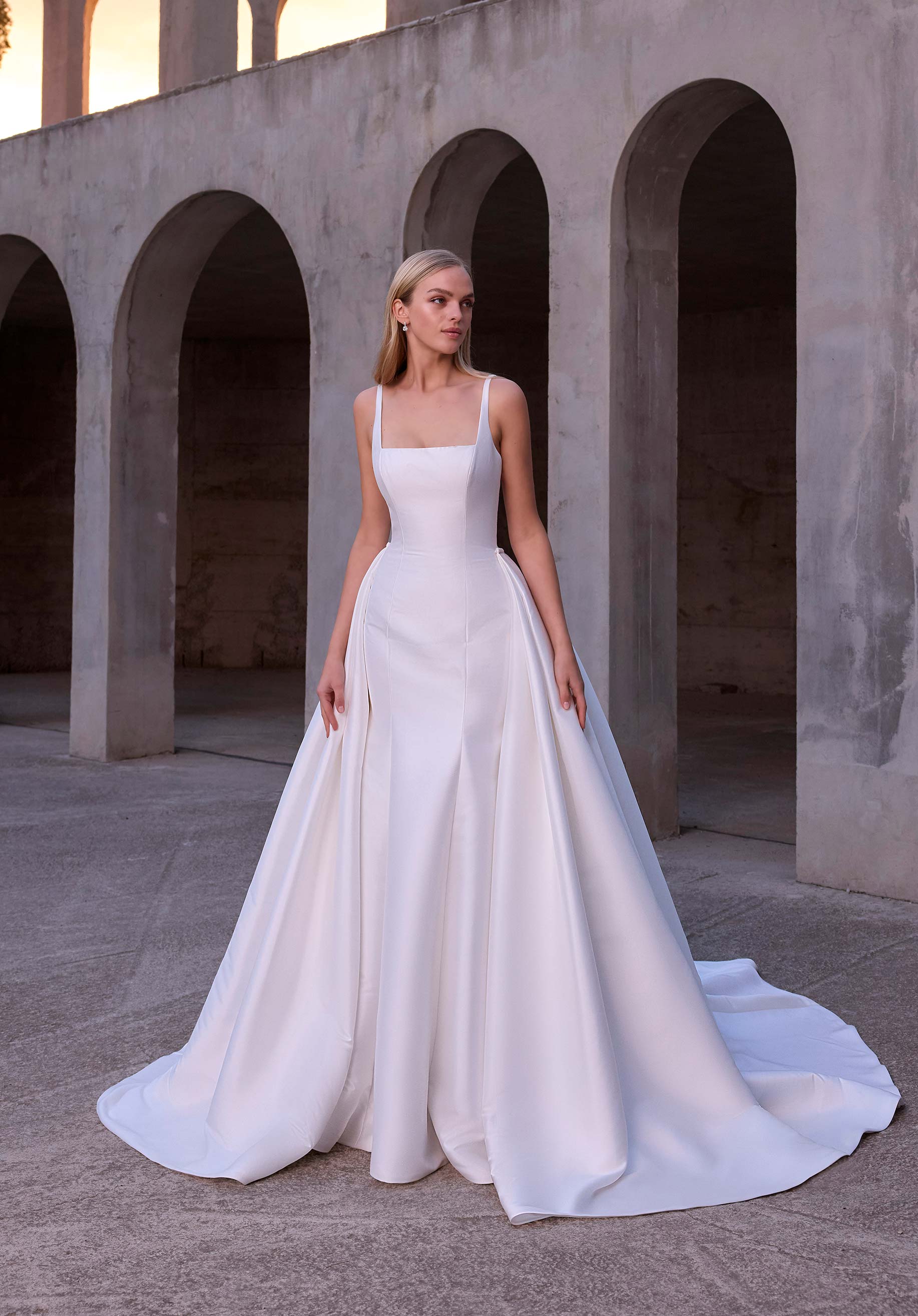 Silky mikado fit and flare wedding dress has a square neck and square back with a detachable full overskirt. Bridal gown available without overskirt as Style 2918D.