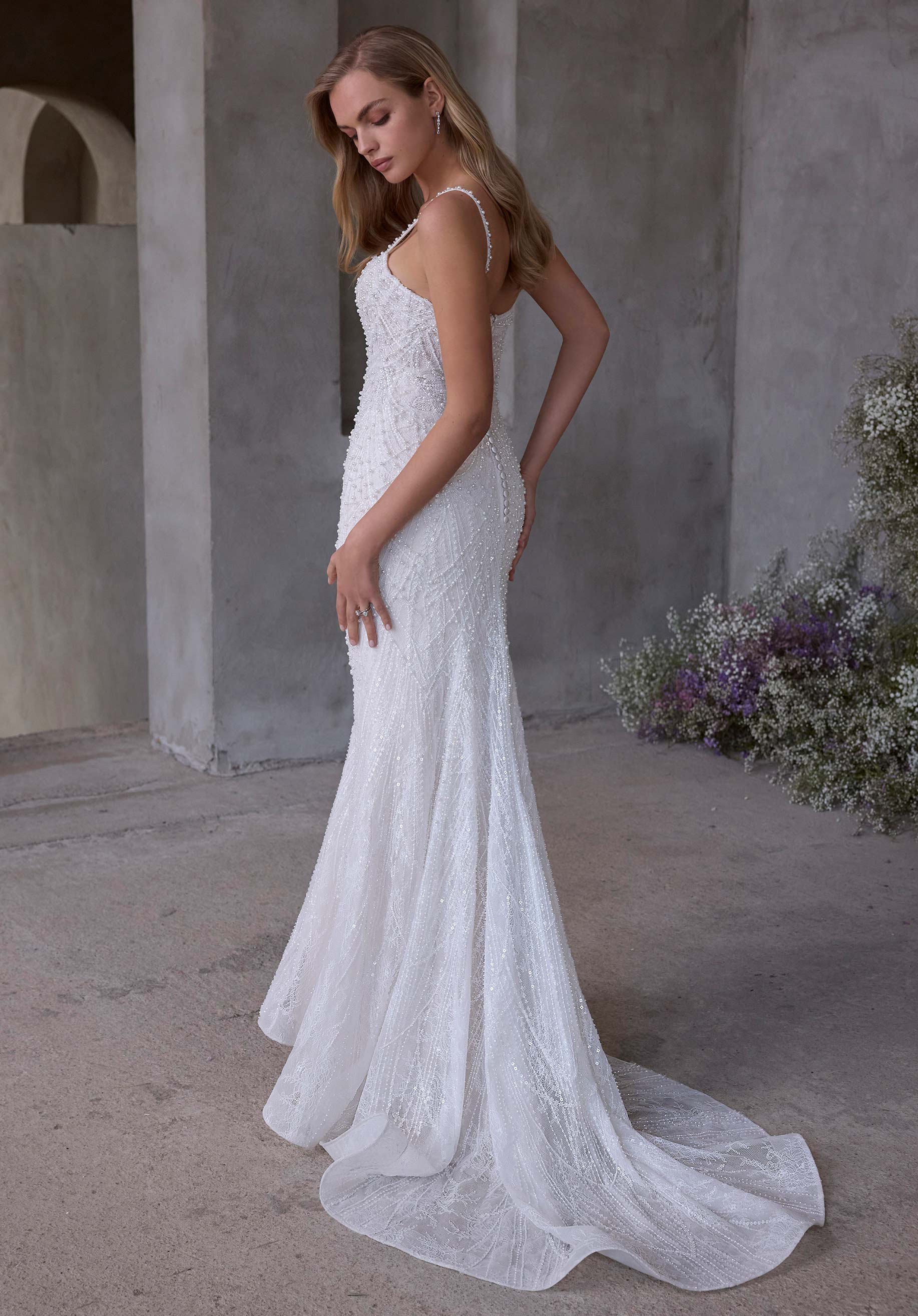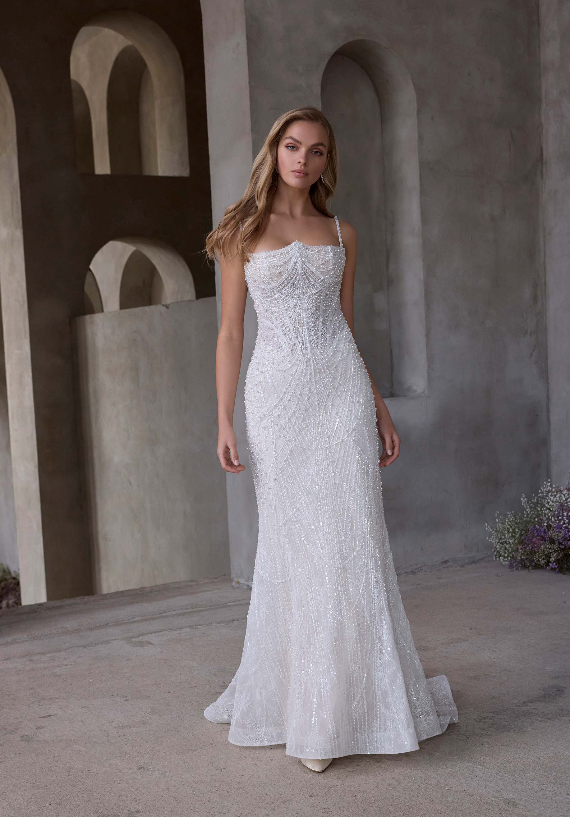 Fit and flare wedding dress has an angel wing neckline with thin straps and a basque waist on allover pearl embroidered tulle.