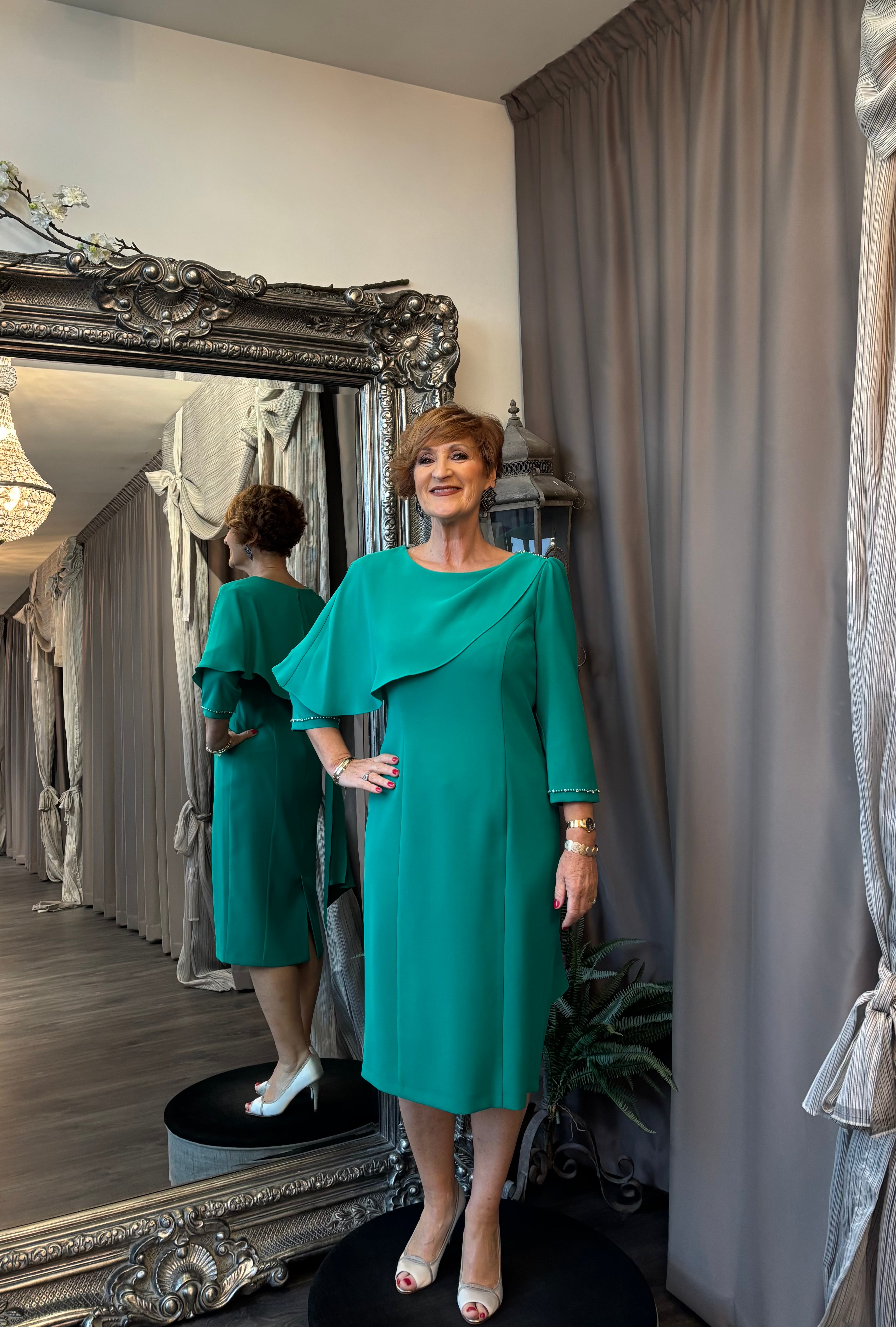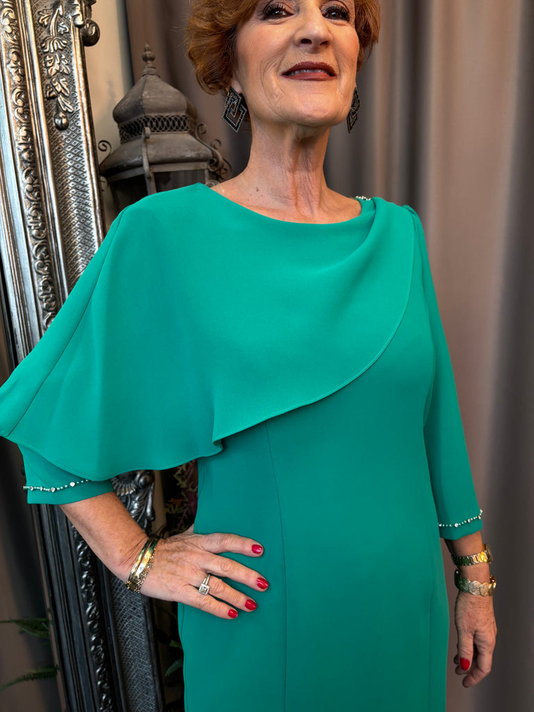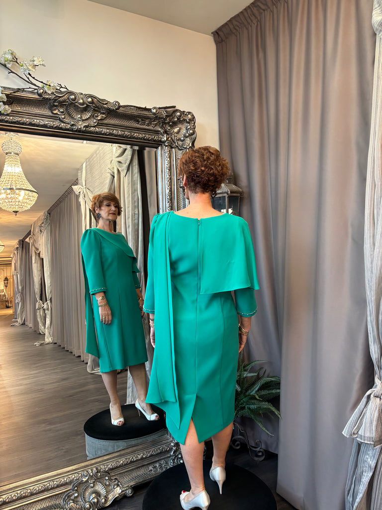 Make a sophisticated statement in this beautiful, emerald-green knee-length shift dress. Designed for polished daytime events and formal evenings, this dress offers a timeless silhouette with luxurious detailing.