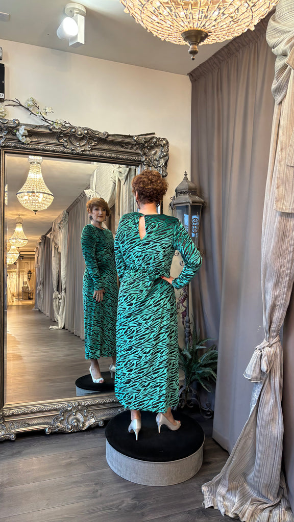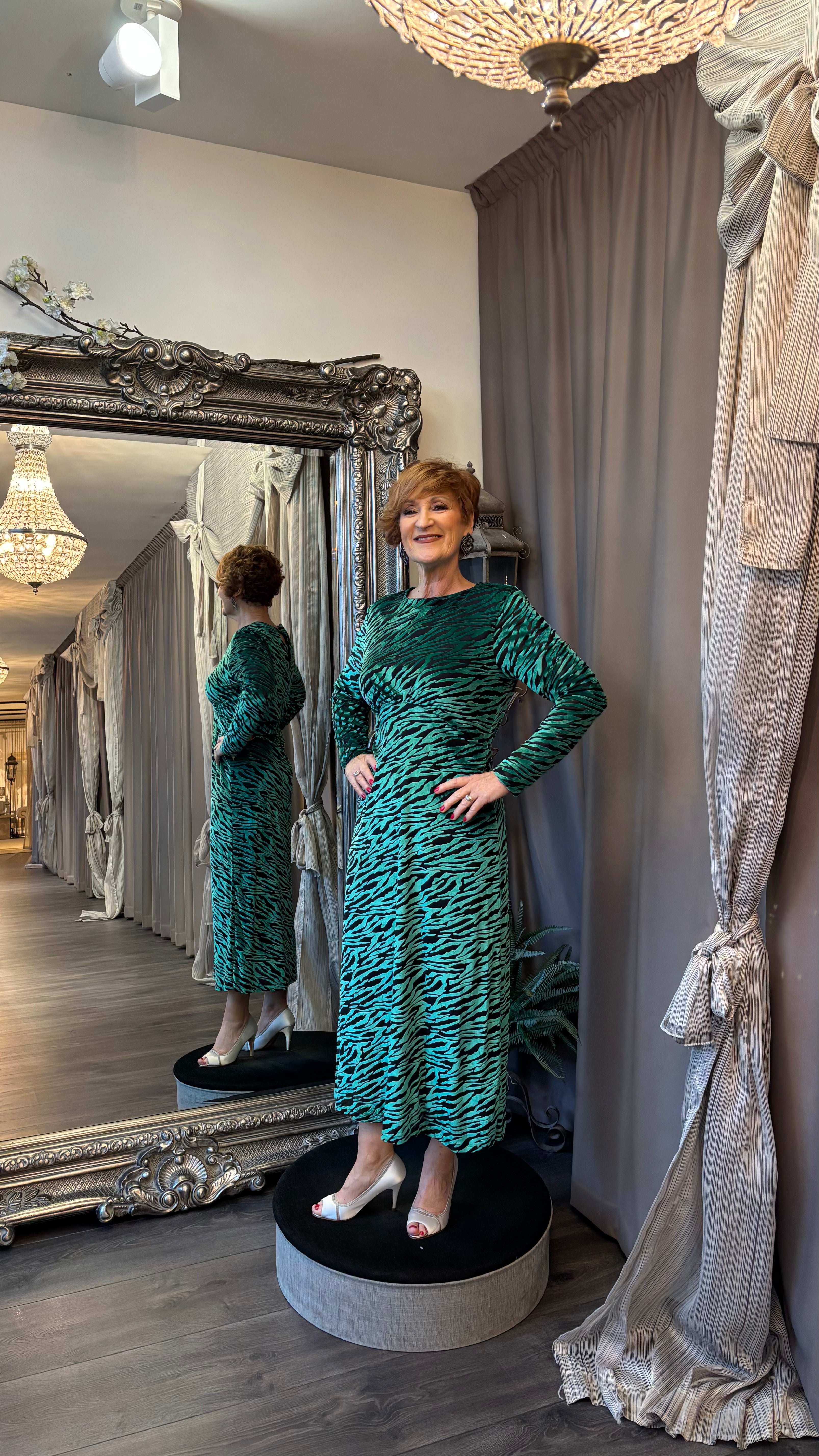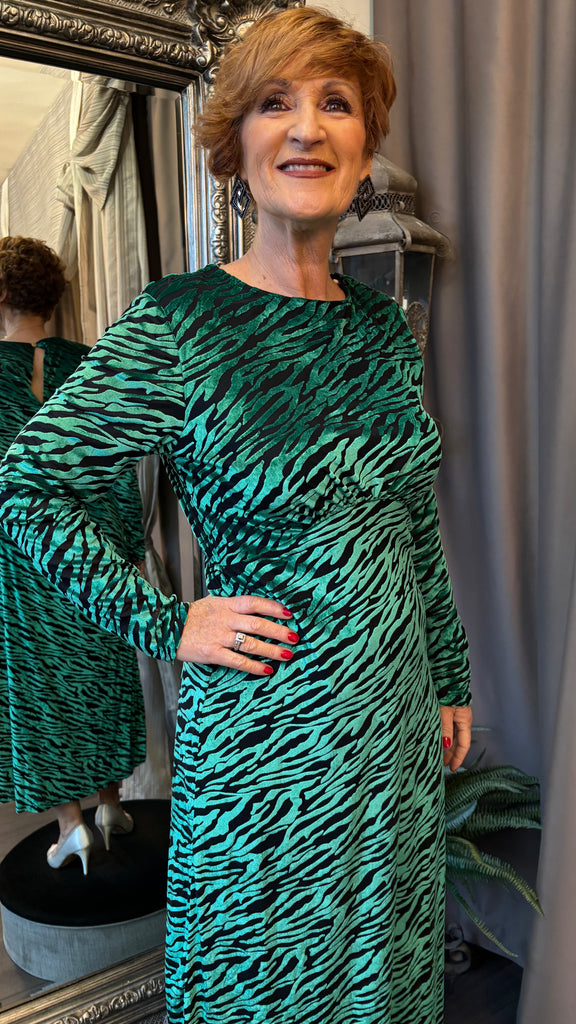 A chic midi-length dress in a bold green and black zebra stripe or animal print. It features a classic round neckline, long sleeves, and a flattering fit-and-flare silhouette that falls below the knee. This dress offers a contemporary, eye-catching style.